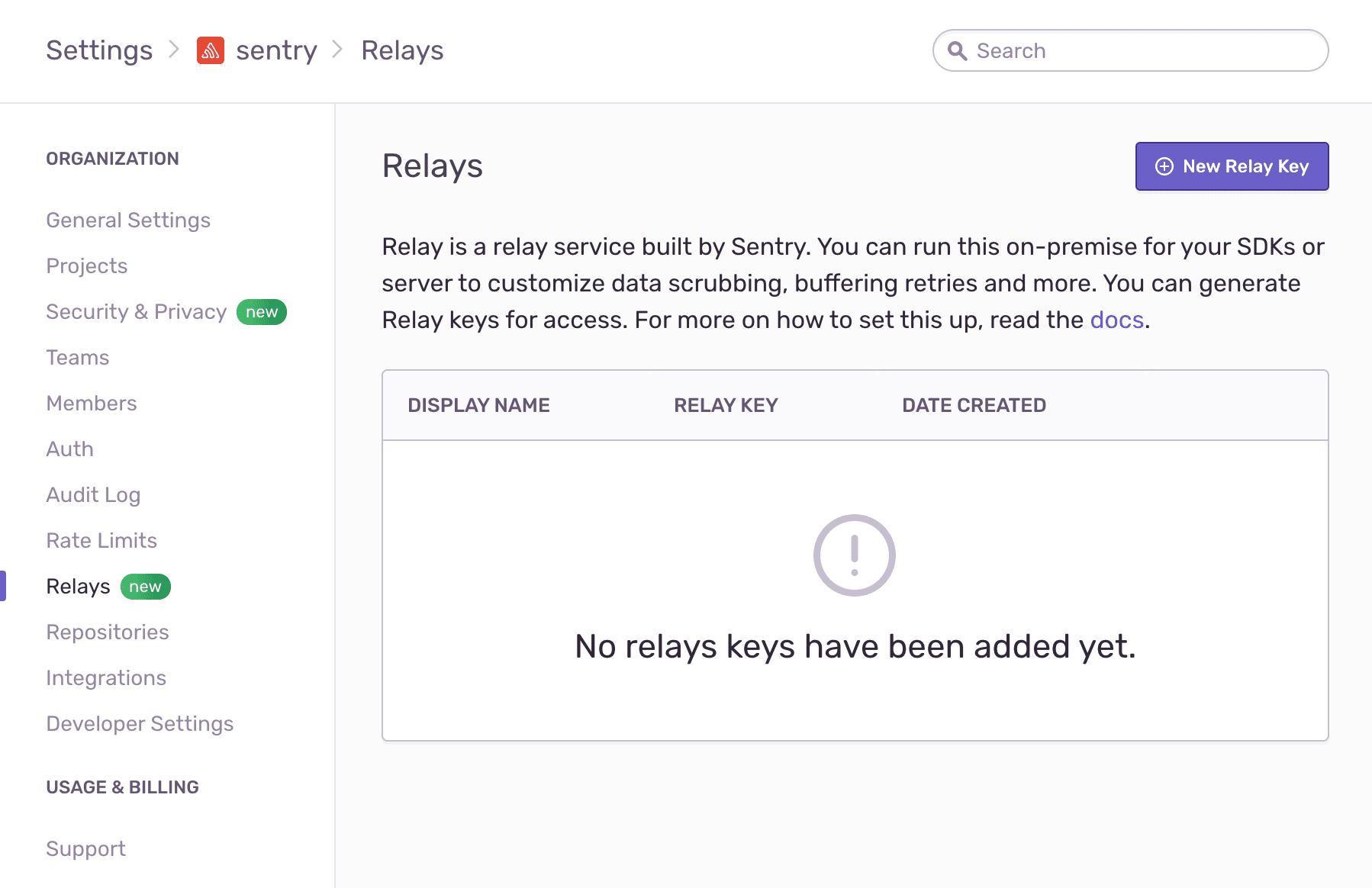 credentials.jsonfile or by running:Copieddocker run --rm -it \ -v $(pwd)/config/:/work/.relay/ \ getsentry/relay \ credentials showClick on Settings in the main navigation for Sentry, then select Relays.